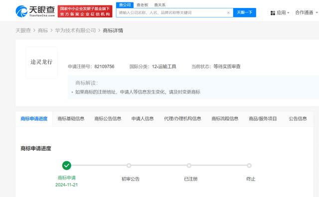 天眼查知识产权信息显示,近日,华为技术有限公司申请注册两枚“途灵龙行”商标,国际分类为运输工具、科学仪器,当前商标状态均为等待实质审查。