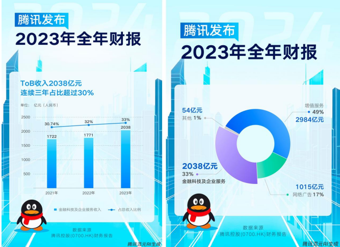 具体到云业务,2023年腾讯云收入稳步增长,助力企业服务收入实现约20%的同比增加。