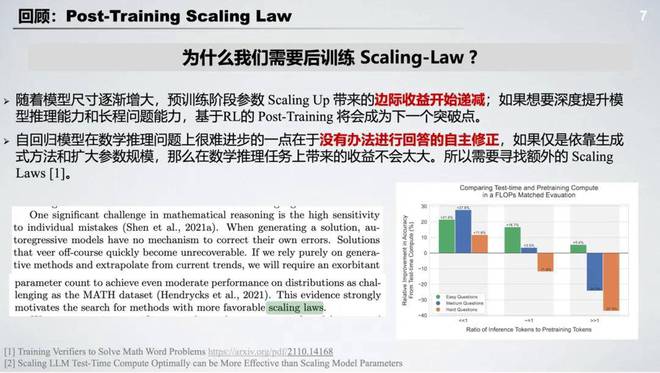 为什么我们需要后训练扩展律?其实早在 2022 年就有启发的认知,主要是出于两个原因:第一个是随着模型尺寸的逐渐增大,预训练阶段参数的扩展带来的边际收益开始逐步递减,如果想要深度提升模型的推理能力和长程问题的能力,基于强化学习的后训练将会成为下一个突破点;第二个也就是自回归模型在传统的像数学推理问题上很难进步,其中的关键一点就是没有办法进行回答的自主修正,那如果仅是依靠生成的方法和扩大参数的规模在数学和推理任务上带来的收益不会很大。所以我们迫切地需要额外的 Scaling Law 也是额外的扩展律。