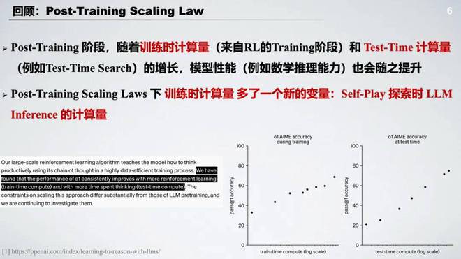 那么我们首先回顾一下预训练阶段的扩展律。其实也就是在预训练模型上,计算量数据和参数量成一个类似于正比的关系,也就是算力等于 6 倍的参数量乘上数据量。因此在大模型时代发展的初期,囤卡提升预训练的算力和模型参数变成了主要目标。