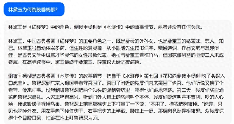 为了更好测试日常对话中的非常规对话的理解,记者讲了“网络冷笑话”——林黛玉为何倒拔垂杨柳,结果难倒了一批大模型:豆包判断出林黛玉和倒拔垂杨柳出自不同的典故,解释了两者的原始出处,并指出两者毫无关联,但没有找出这句话背后的“网梗”,而通义千问和智谱清言敏锐地发现了“网梗”,还将原文出处和网友们的联想全部展现出来。