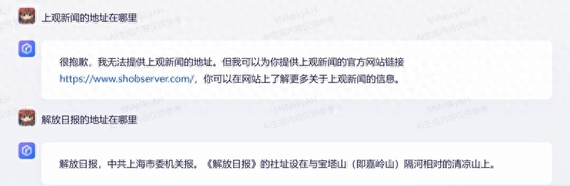 上观新闻是解放日报旗下新媒体,通过询问解放日报和上观新闻的地址,既能考验大模型的搜索能力,还能判断出大模型能否将二者联系在一起。