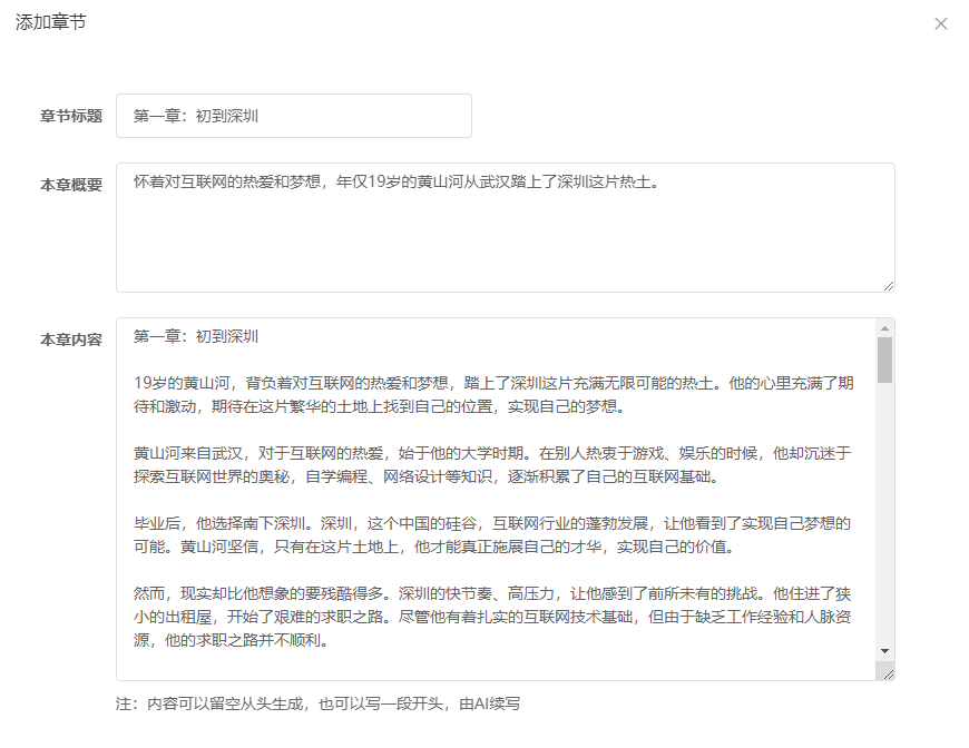 三、点击添加章节,输入每个章节的名称和本章概要即本章要表达的主题内容、观点、思想等。本章内容可以自己输入一部分,AI写一部分,如果不输入,全部让AI来写。